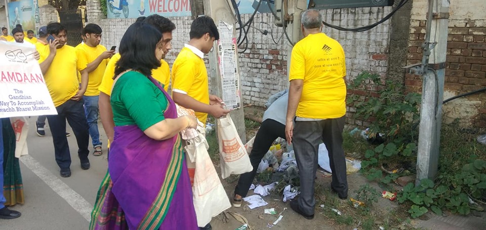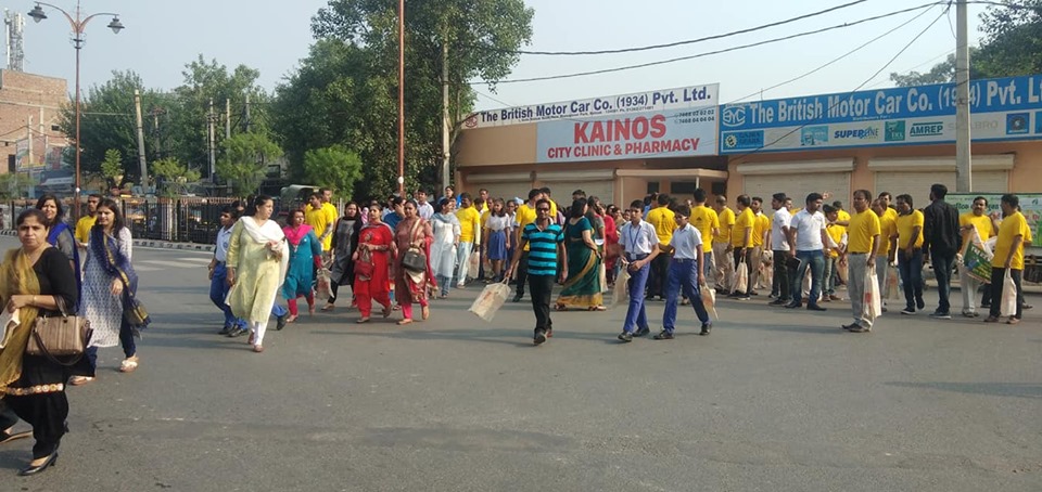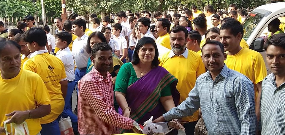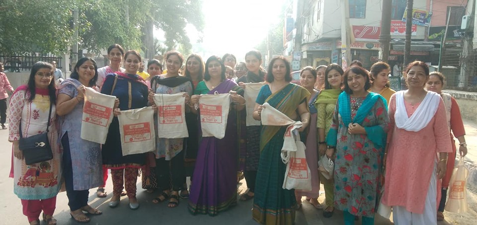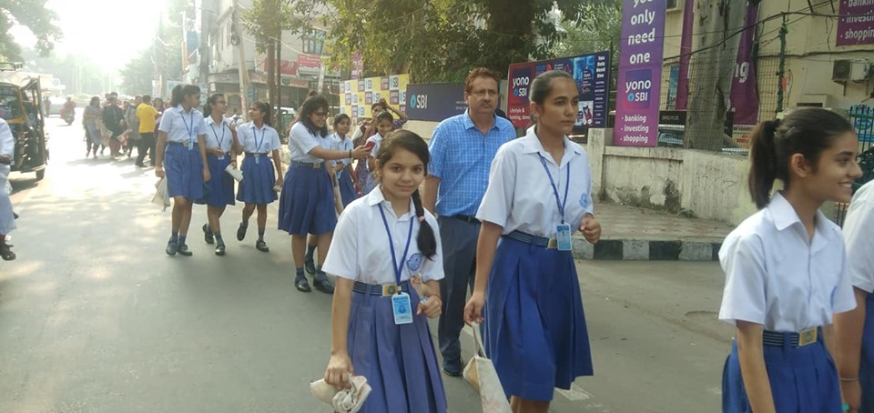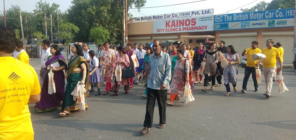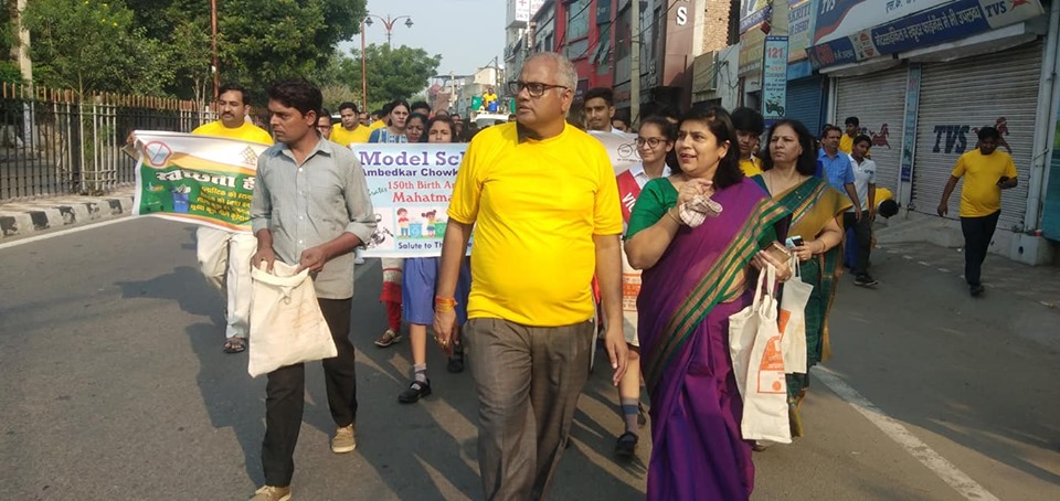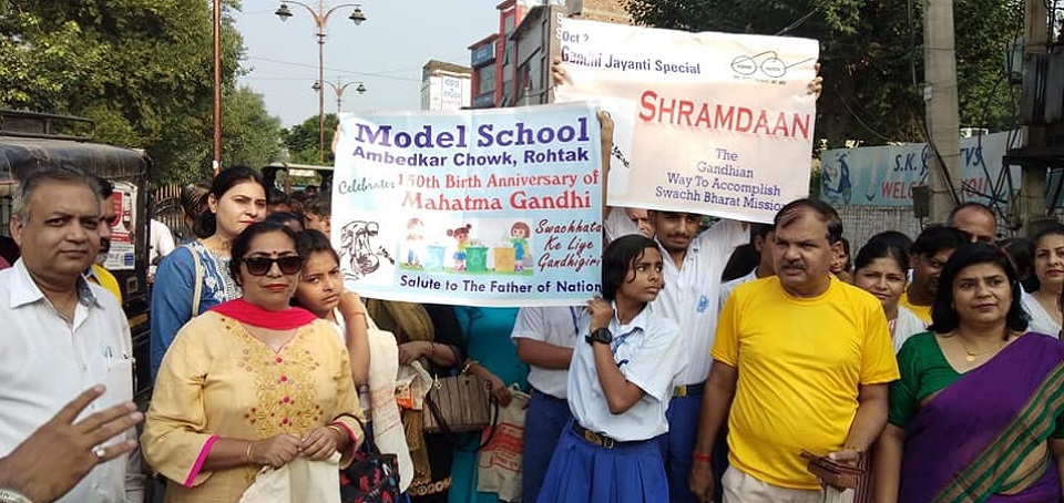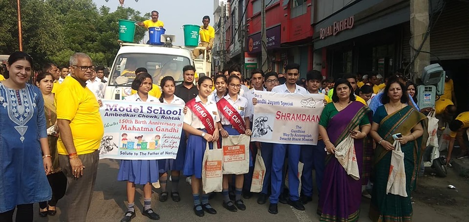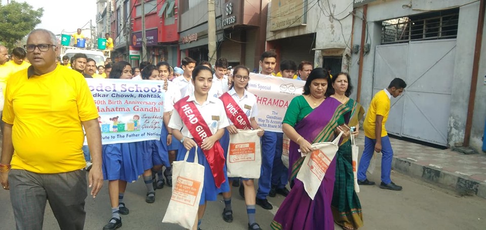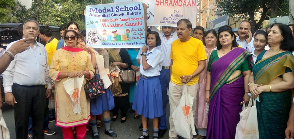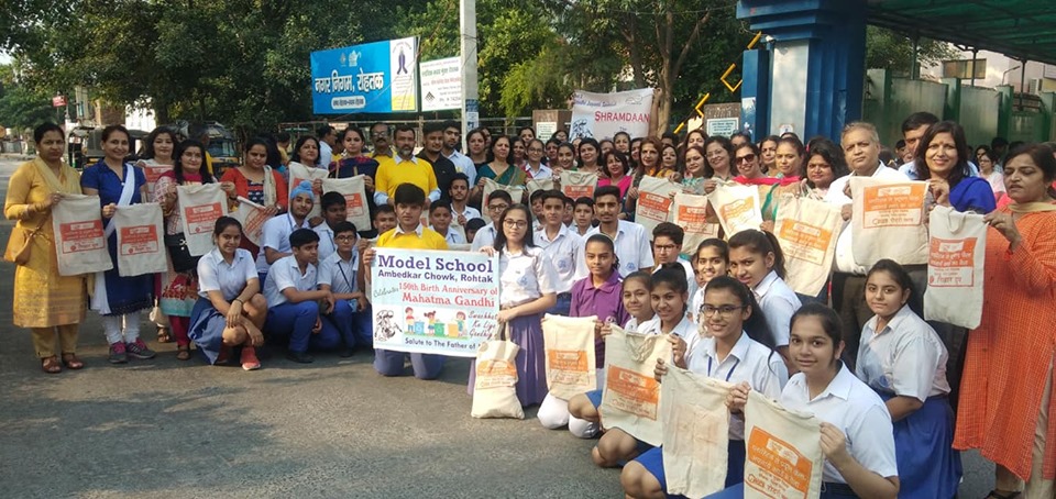 Students and staff members of Model School, Ambedkar Chowk celebrated Mahatma Gandhi's 150th birth anniversary.The school, in collaboration with Municipal Corporation Rohtak, organised a rally spreading awareness amongst the masses against the use of "SINGLE USE PLASTIC" and distributing jute bags to help the cause.The rally was flagged off by Municipal Commissioner Mr Pradeep Godara and S T P Mr. Varshanay accompanied by our Principal Dr Aruna Taneja and Vice Principal Mrs.Anita Malik.